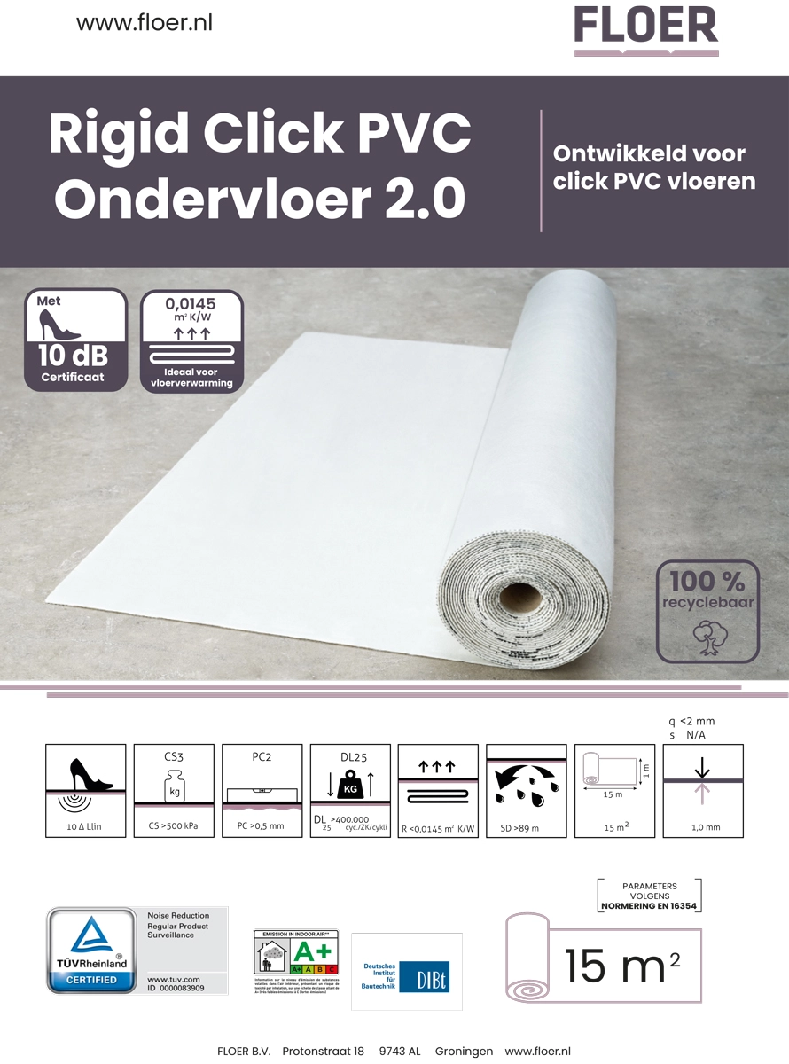 De ondervloer biedt een zeer hoge drukweerstand en is geschikt voor alle varianten binnen de Floer Click PVC collectie, zoals visgraat, walvisgraat, landhuis en tegelvarianten. In combinatie met deze ondervloer blijft de kwaliteit van de vloer behouden en voldoet de vloer aan de voorwaarden voor de fabrieksgarantie.
