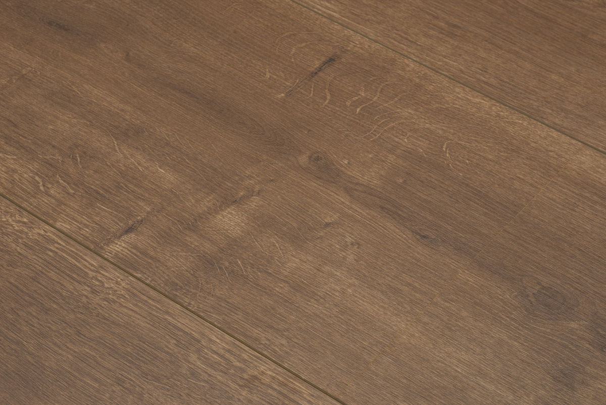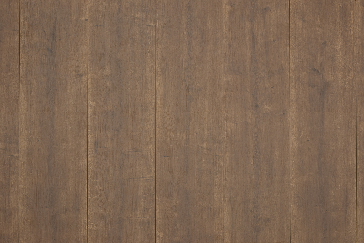 De structuur van het eiken patroon is voelbaar in de toplaag van de kasteel formaat plank. De laminaat planken worden met veel verschillende structuren geproduceerd. Hierdoor komen er nooit gelijken naast elkaar te liggen. Daarnaast beschikt deze vloer over een doorlopend patroon, wat zorgt voor eindeloos lange banen. Dit samen met de unieke breedte van 32 cm geeft deze extra brede laminaat de uitstraling van een echte eiken houten parket vloer.