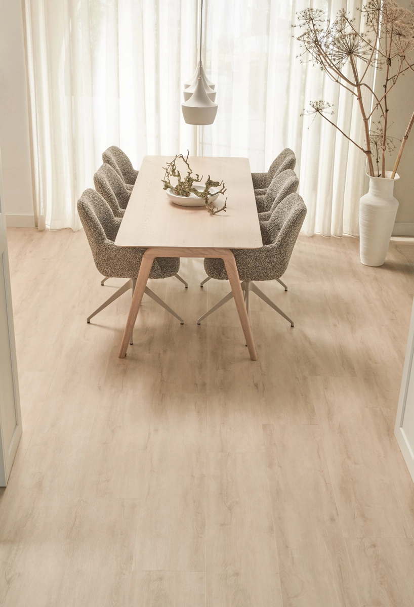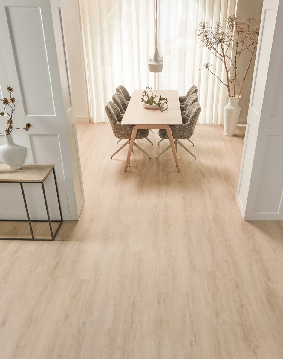De Landhuis Click PVC Crème Eik van Floer is ontworpen voor wie houdt van sfeer en gemak. De click-constructie maakt de vloer eenvoudig te leggen en zorgt voor een strak en solide geheel. De warme crème tint laat zich goed combineren met natuurlijke materialen, zachte stoffen en uiteenlopende woonstijlen.