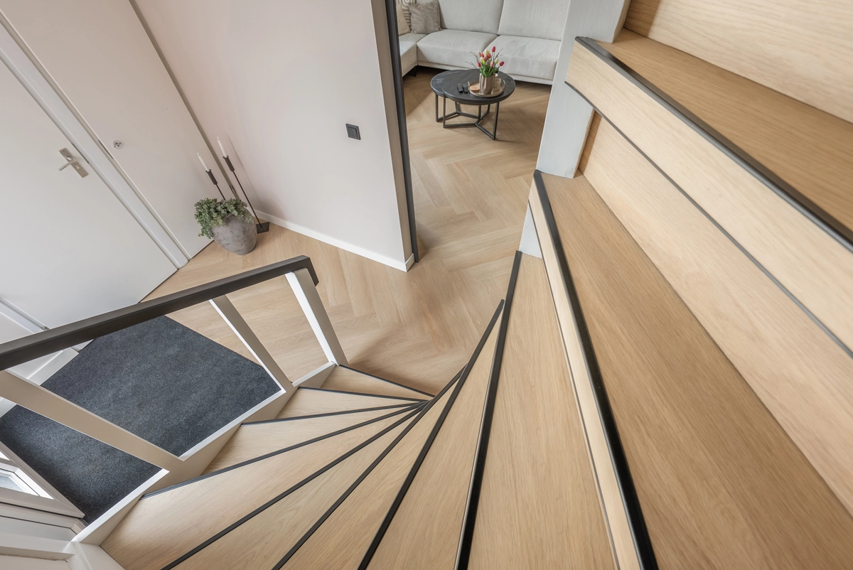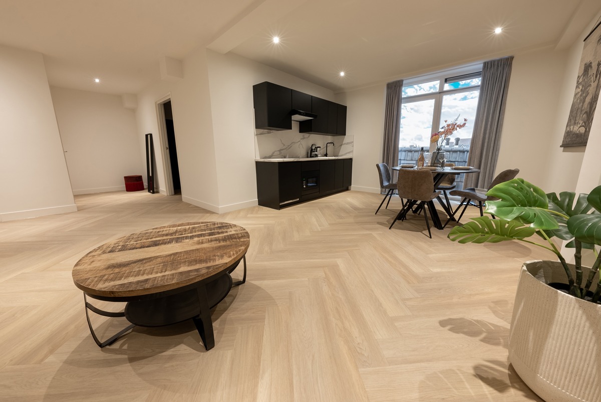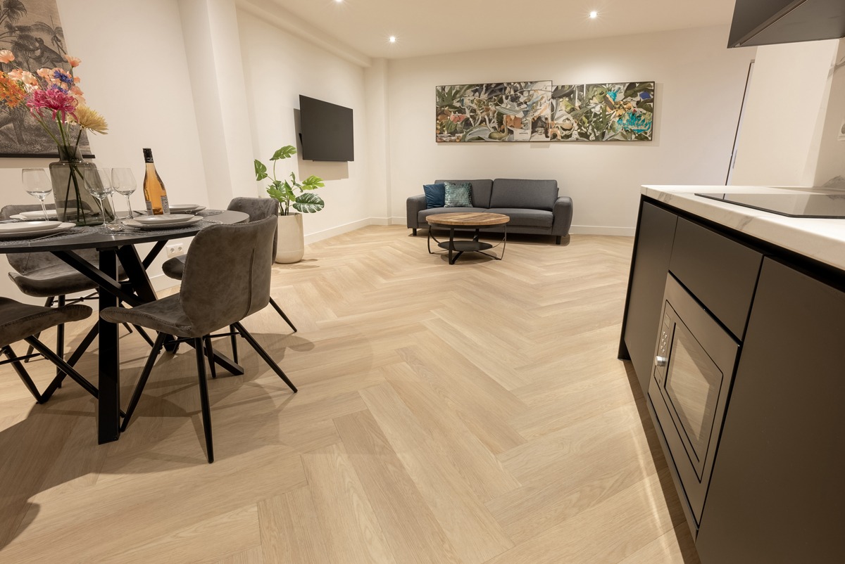 De vloer combineert eenvoudig met lichte en donkere meubels, natuurlijke materialen en rustige tinten. Daardoor voelt hij zich net zo thuis in een modern interieur als in een warm gezinshuis.