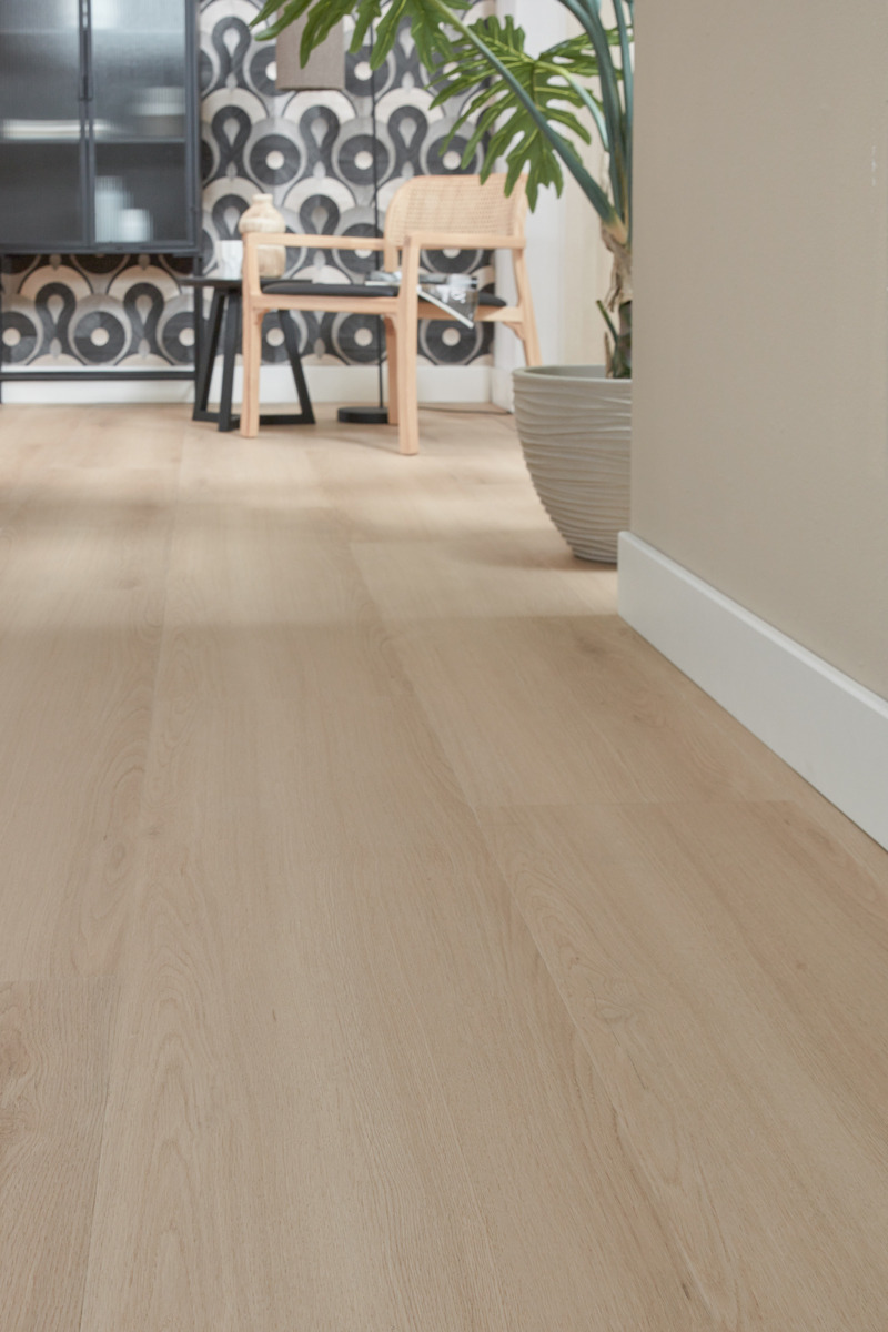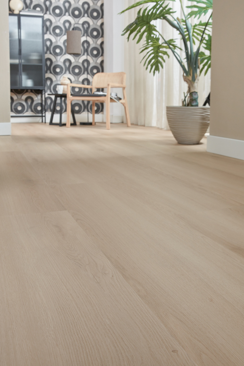 Benieuwd hoe deze warme lichtbruine eikenlook in jouw woning uitpakt? Kom langs in onze showroom of vraag een staal aan.