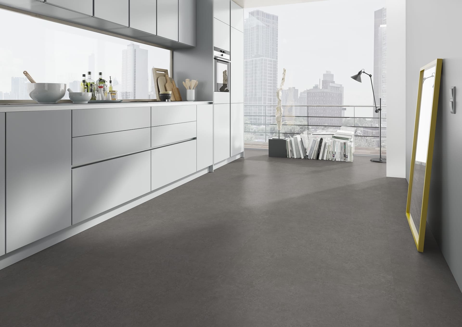 De natuurlijke steenstructuur en matte afwerking geven de vloer een realistische uitstraling die perfect past in moderne, industriële en minimalistische interieurs.
